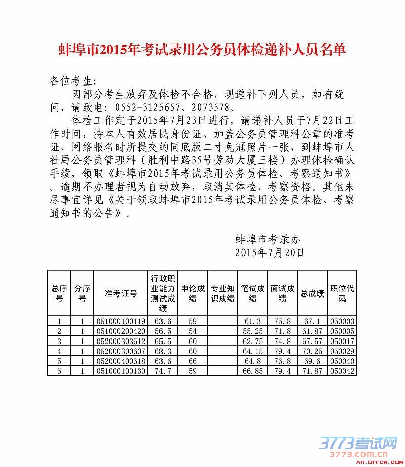 [图文]2015年安徽蚌埠市考试录用公务员体检递补人员名单