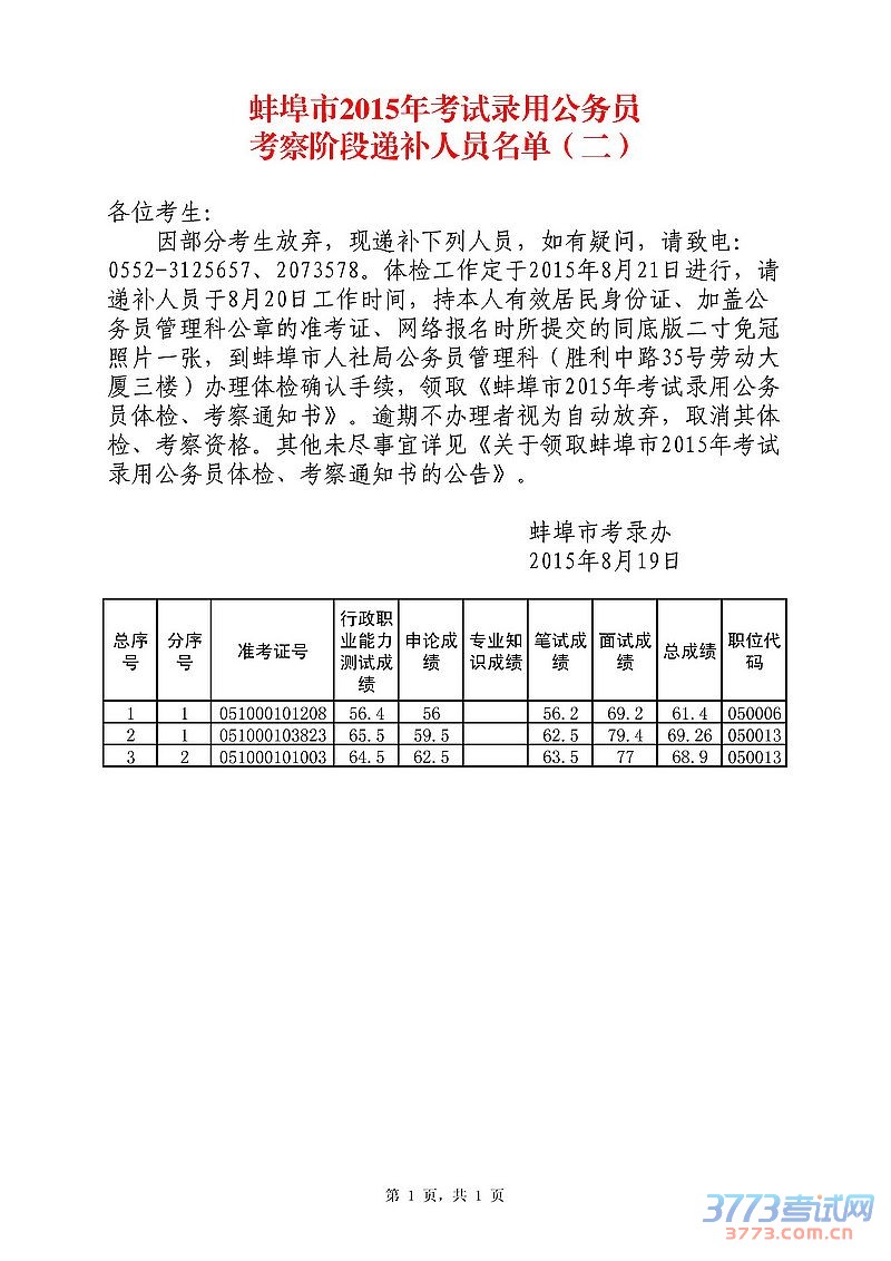 [图文]2015年安徽蚌埠市公务员考察阶段递补人员名单(二)