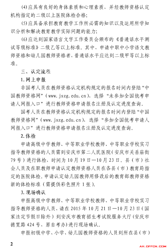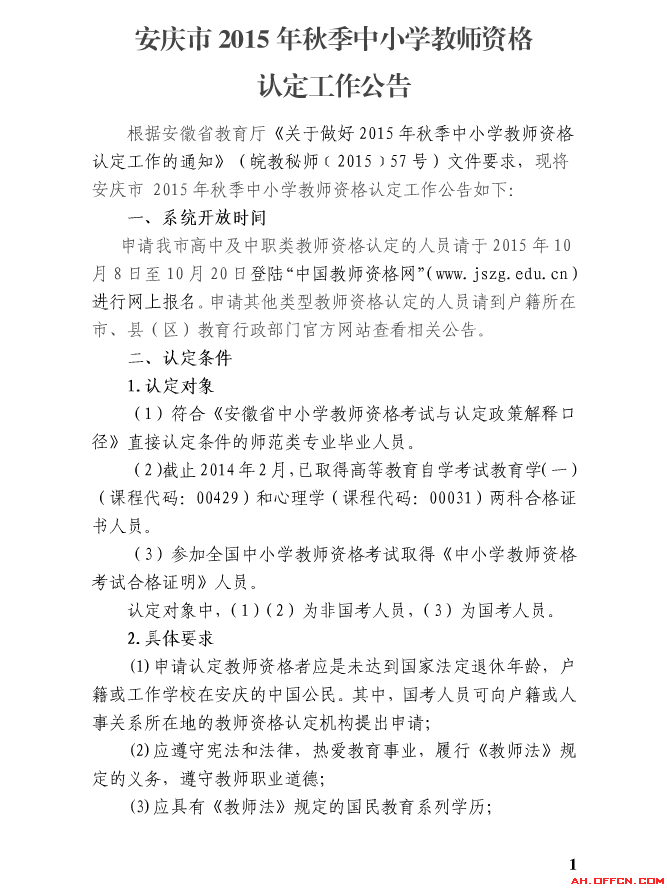 [组图]安徽安庆市2015秋季中小学教师资格认定公告