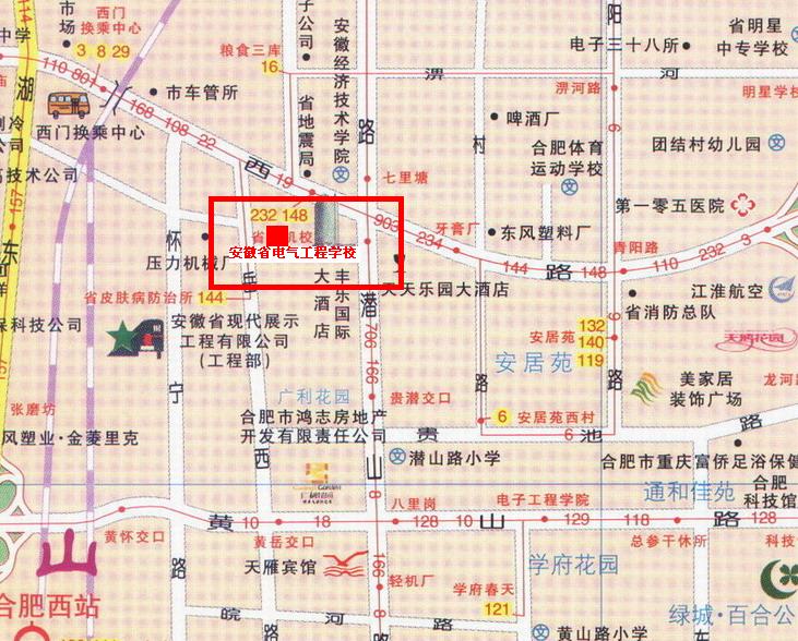 2 | 安徽电气工程学校(原省农机校) | 查看地图 | 合肥市长江西路539号 | 0551-2320507 | 3、144、168、801、903(省农机校) |
