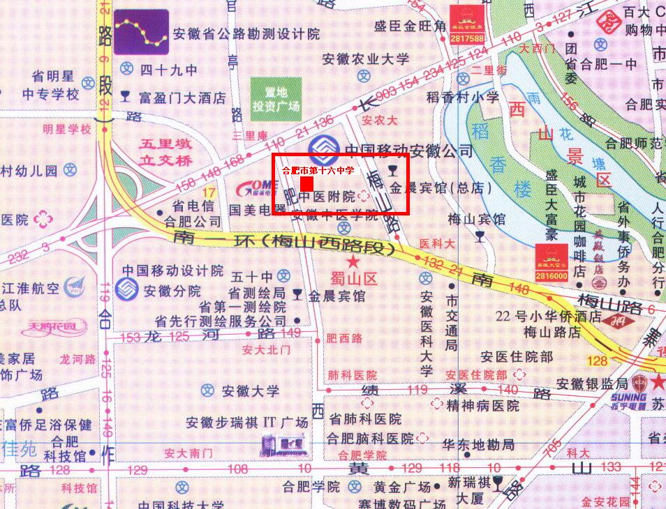 3 | 合肥市第十六中学 | 查看地图 | 合肥市肥西路80号 | 0551-5120615 | 3、9、116、136、168(国购广场或肥西路) |