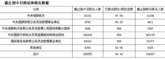 截止到今日下午16:30,报名且通过审查的总人数已达393055人。中央党群机关、中央党群参照公务员法管理事业单位、中央党群机关参照公务员法管理人民团体和群众团体、中央国家行政机关及其直属机构和派出机构、国务院系统参照公务员法管理事业单位及其他单位的报名职位数均已超过了总职位数的90%。预示着报名已经进入了中段,很多考生已经选定了自己的职位。