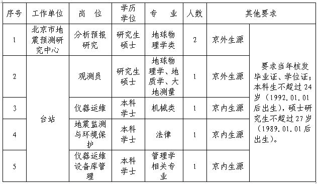 根据中国地震局对招聘工作的有关要求和《北京市地震局公开招聘事业单位工作人员实施办法(试行)》,我局2016年面向社会公开招聘6名应届高校毕业生,现将相关事项公告如下: