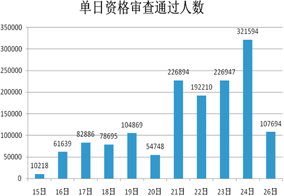 20日一天的报名人数出现了下降,当天只有5万余人通过资格审查,这也是比较正常的情况,因为处在报名时间中段这样一个不上不下的位置上。报名经验不足的考生,在前期基本已经都选择好了职位并通过了资格审查,而等待最佳报考时间的“老油条”们还没有开始发力,因此出现了20日当天“青黄不接”的局面。