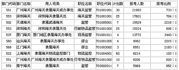 从报名情况看,2010年国家公务员考试,海关系统仍然是顶级火热的职位,达到了“沸点”位置,报考人数最多的前十大职位全部为海关系统。其中以广州海关和深圳海关报考人数最多。 2009年国家公务员考试报考人数排名前十的职位,全部都属于海关系统,前三名为天津海关、深圳海关、厦门海关。2010年国家公务员考试考生报考海关的热度不减2009年。