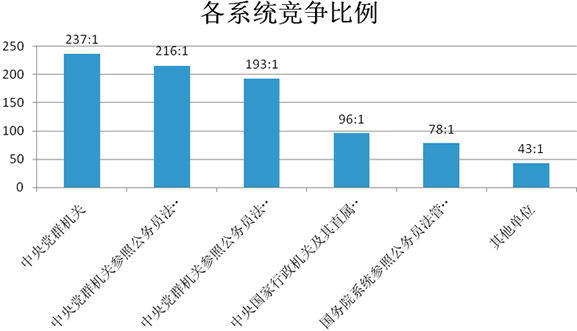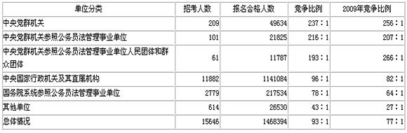 从2010年国家公务员考试整体报考情况来看,中央党群机关毫无疑问是竞争最激烈的系统。值得注意的是,与2009年国家公务员考试各系统的竞争比例数据相比较可以发现:2010年国家公务员考试各系统的最高竞争比例和最低竞争比例的差距缩小了。这表明2010年国家公务员考试的招考政策起到了明显的导向作用。报名截止时招考机构发布的简报显示:“根据从已通过资格审查人员的情况看,报考中央机关及其省级以上直属机构的共有23万人,其中具有两年以上基层工作经历的人员达14万人,占61 %。报考县级以下职位的共有80万人,其中应届高校毕业生占61 %。报考人员中具有本科以上学历的共有 124万人。”