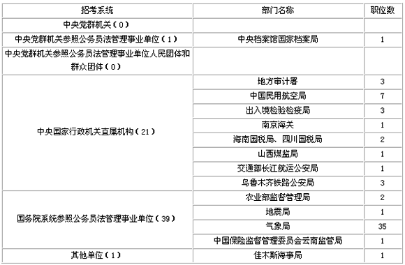 2010年国家公务员考试无人报考职位主要集中在气象局、民航系统,气象部门。此外,2010年国家公务员考试中还有298个职位报考人数较少,报考比例低于3:1。主要分布于铁路公安局、民航、地方审计署等系统。