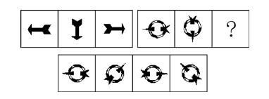 【解析】C。位置类。观察题干中给出的已知图形,可以发现题干中给出的三个图形完全相同,但位置方向有明显变化,因此,本题是对位置类中图形旋转方向及角度的考察。每段图形中的图形依次在做逆时针旋转左侧三个图形中,前一个图形一次逆时针旋转90°得到后一个图形,右侧前两个图形也符合此规律,故正确答案为C。