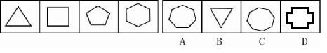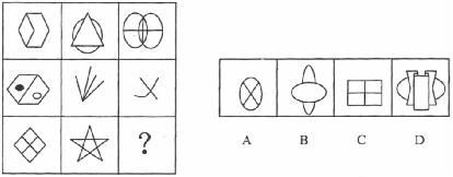 观察到图形线的特征明显,整体数所有线没有规律,但观察发现已知8个图形都含有直线,故本题很可能为数直线,直线数成什么规律呢?若从第一行数起,前面数量较多,不好理出头绪,但若从最小的数起找规律便会快很多。最少的直线数为第二行第三个图1,再其次为第一行第三个图2,……最后即可找出S形的规律,故此题应该选直线数为0的答案,即B。