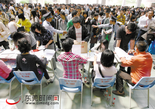 东莞时间网讯 昨日,东莞理工学院城市学院礼堂前,专门卖盒饭给报考2009年公务员考生的一个小伙儿笑得特别灿烂。他拿着一沓百元钞票笑着说:“今年的人确实比去年多。”