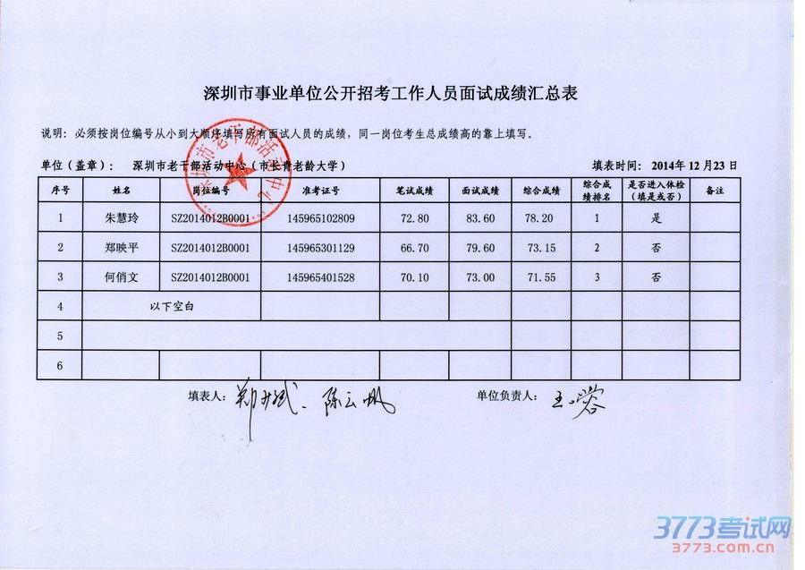 [组图]2014年10月广东深圳市老干部活动中心(市长青老龄大学)招考面试成绩汇总表