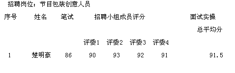 从5月8日起至5月18日止,我台公开发布招聘节目包装创意人员招聘信息。根据我台节目包装创意人员招聘方案,采用面试、笔试、实操等环节进行综合考核。现对符合条件应试人员成绩公示。
