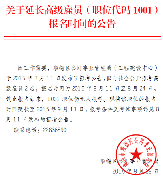 [图文]2015广东佛山市顺德区公用事业管理局招聘延长报名时间公告