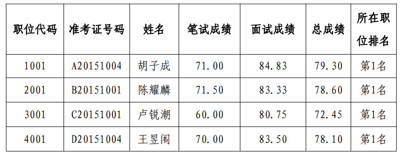 胡子成、陈耀麟、卢锐潮、王昱闱 4 人经过笔试、面试、体检、考察合格,拟录用为顺德区城市更新发展中心工作人员,现根据有关规定予以公示。公示期间,如对拟录用人员有异议的, 请直接向我中心反映。