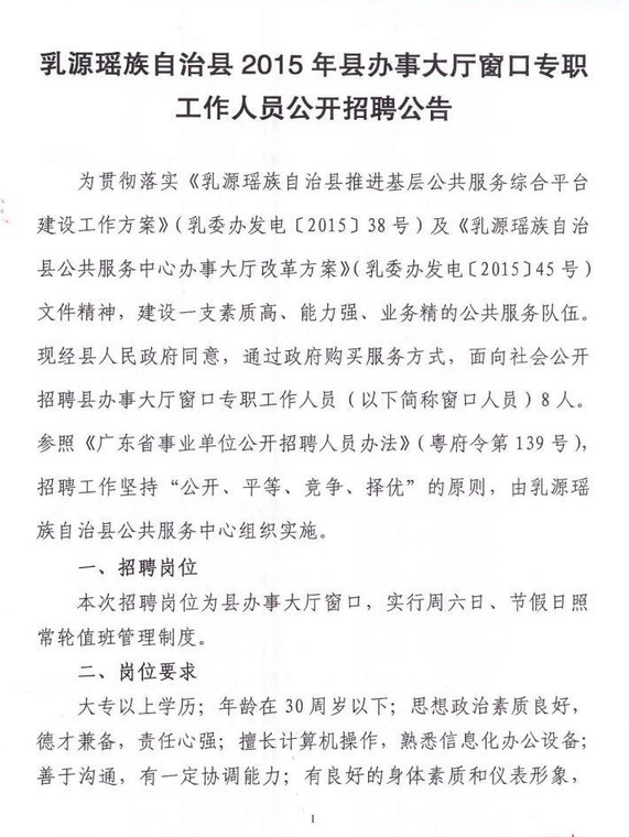 [组图]2015广东乳源瑶族自治县办事大厅窗口专职人员招聘公告