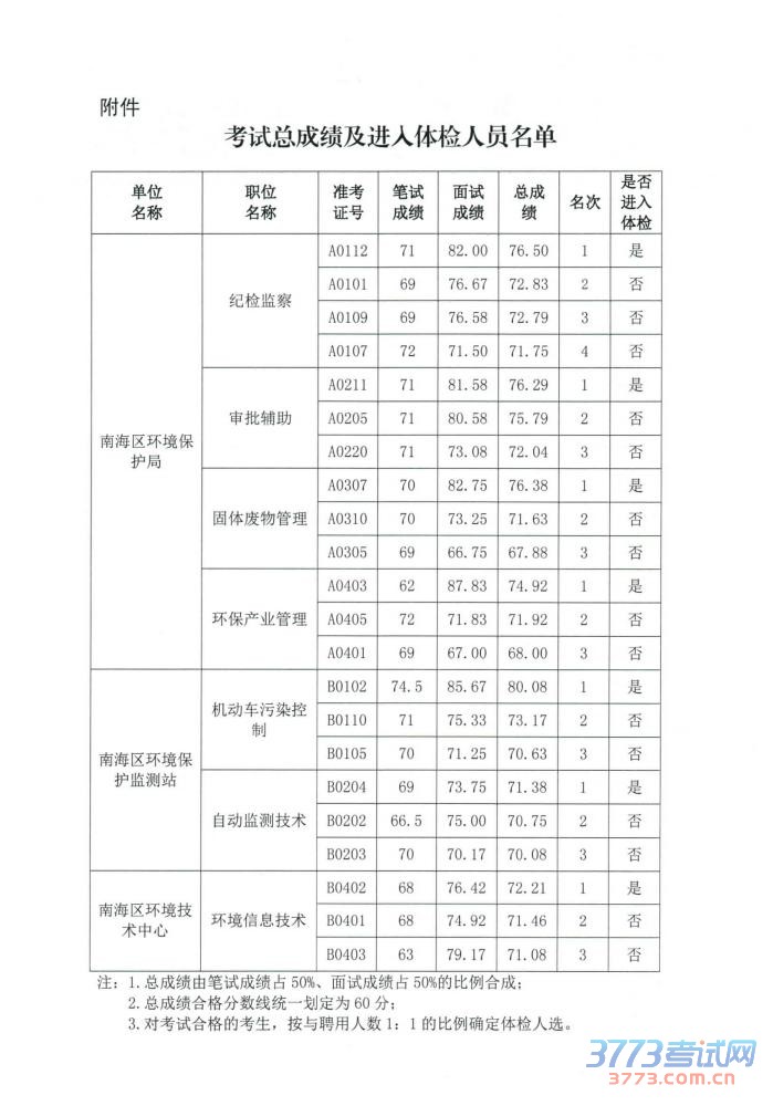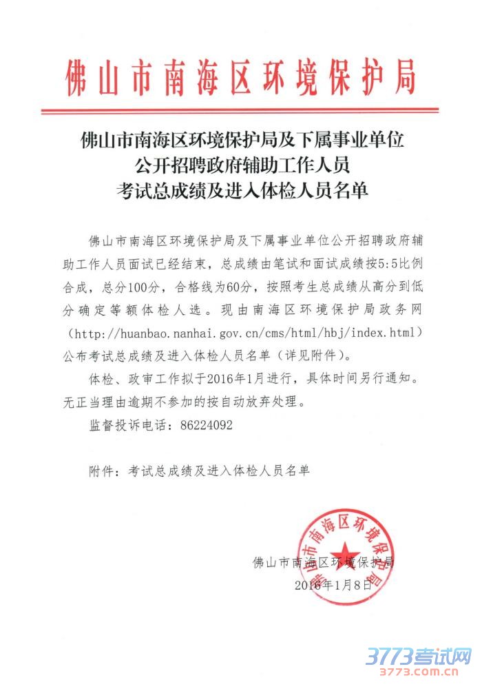 [组图]2015广东南海区环境保护局及下属事业单位招聘总成绩及体检名单公告