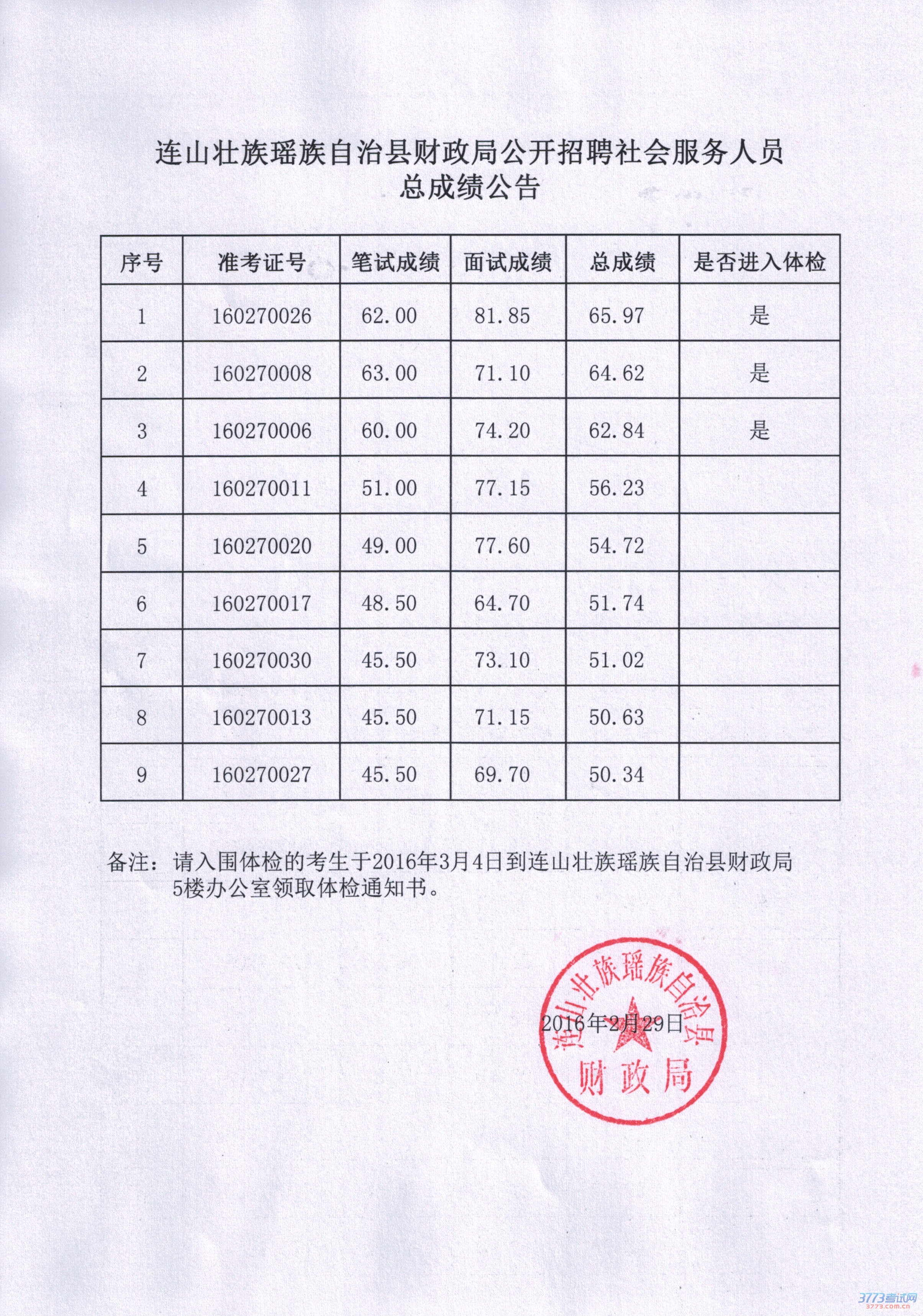 [图文]2016广东连山壮族瑶族自治县财政局招聘总成绩公告