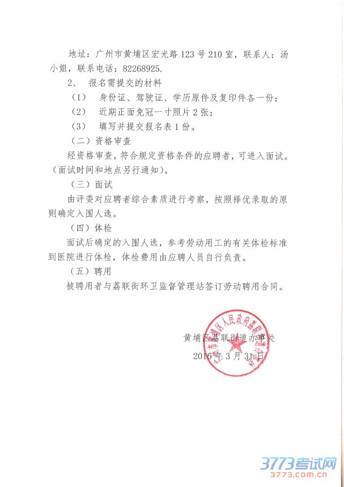 [组图]2016广东黄浦区荔联街环卫监督管理站招聘公告