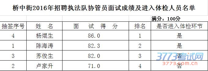 [图文]2016广东荔湾区桥中街执法队协管员招聘面试成绩及体检公告