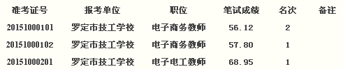 2015年罗定市技工学校公开选调教师笔试于2015年11月7日在罗定市技工学校进行,根据《2015年罗定市技工学校公开选调教师实施办法》要求,现将考生笔试成绩予以公示,公示如下: