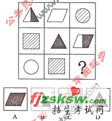 【华图解答】本题正确答案为D。9个图形从上至下从左至右的图形依次为三角形、平行四边形、圆形和长方形,且每个图形内的花纹与其上下左右的图形全异。故答案为D。