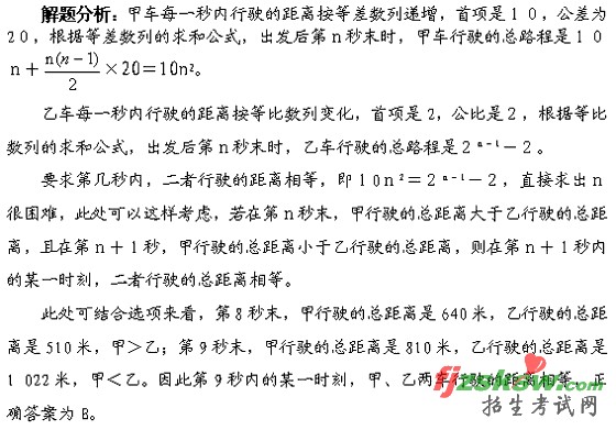 例题2:甲、乙两辆汽车在公路上从同一起点朝同一方向同时沿直线前进,在第一秒内,甲车行驶了10米,乙车行驶了2米,此后每一秒内,甲车行驶的距离都比前一秒行驶的距离多20米,乙车行驶的距离都是前一秒行驶距离的2倍,问出发后的第几秒内的某一时刻,两车行驶的距离相等?