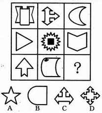 【解析】D。本题干中每个图形都为轴对称图形,但仔细观察可发现每一行或每一列都有一个中心对称图形,注意左上角的图形为一个立方图形,可看做中心对称。由于第三列和第三行都没有中心对称图形,故选D。