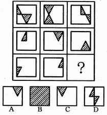 【解析】B。分析图形知,前八个图形的阴影部分两种组合在一起正好是一个正方形阴影,故选B。
