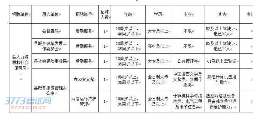 招聘人数:5人,其中:县督查局1人,县城乡改革发展工作委员会1人,县社会保险事业局1人,县政务服务管理办公室2人。