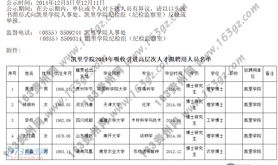 [图文]贵州凯里学院2014年吸收引进高层次人才拟聘用人员公示