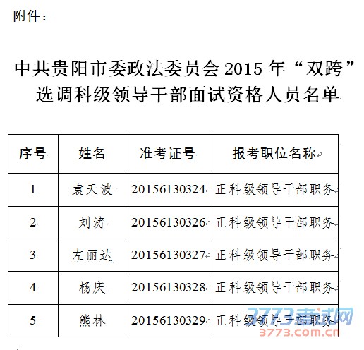 根据《贵阳市2015年“双跨”选调科级领导干部公告》的有关规定,现将进入面试资格人员名单予以公告,并将有关事宜公告如下: