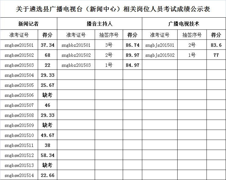 根据《关于在全县范围内遴选县广播电视台(新闻中心)相关岗位人员的公告》要求,2015年9月1日上午,经组织报考新闻记者岗位人员笔试、报考播音主持人现场上镜考试、报考广播电视技术人员现场制作考试,现将考试成绩予以公示,公示期3天。