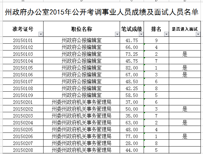 根据《州政府办公室2015年公开考调事业单位工作人员实施方案》的要求,现将州政府办公室2015年公开考调事业人员笔试成绩名单分职位予以公示。