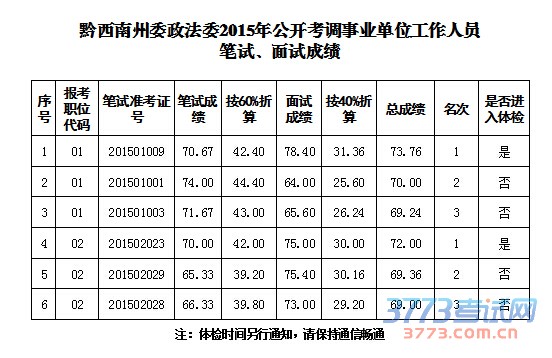 [图文]黔西南州委政法委2015年事业单位招聘笔试、面试成绩公示