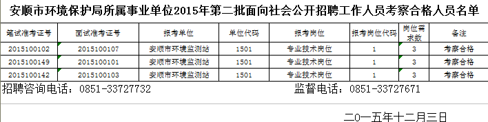 根据《安顺市环境保护局所属事业单位2015年第二批面向社会公开招聘工作人员简章》的规定,安顺市环境保护局所属事业单位公开招聘工作人员考察工作已于2015年12月2日结束,现需将考察合格人员予以公示,公示时间为2015年12月3日至12月7日。如对公示对象有问题反映,请在公示期间向安顺市环境保护局公开招聘领导小组办公室反映。