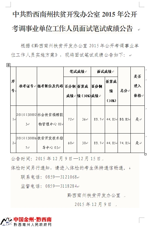 [图文]黔西南州扶贫开发办公室2015年考调事业单位面试笔试成绩公告