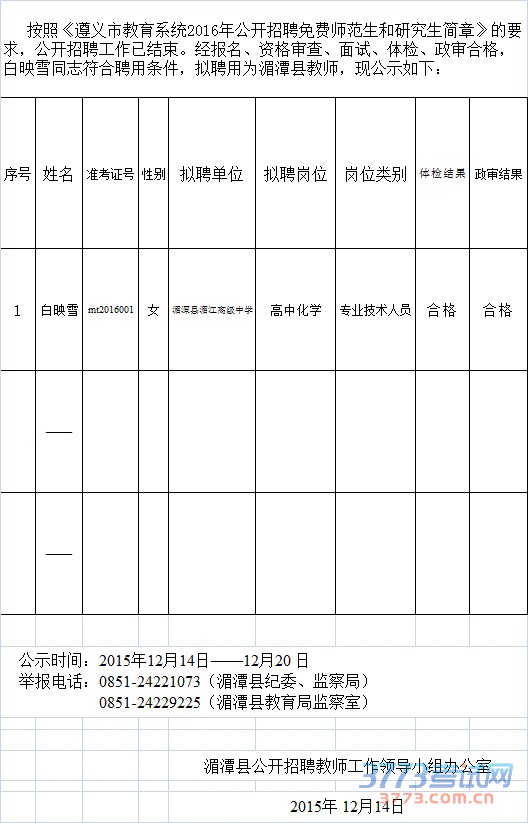 [图文]贵州湄潭县2015免费师范生和研究生拟聘用人员公示(第一批)