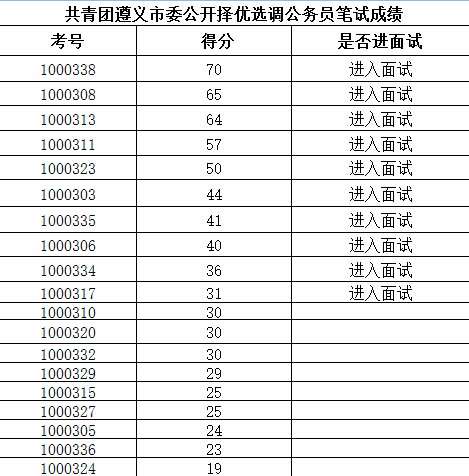 共青团遵义市委(市青少年宫)关于公开择优选调公务员(工作人员)笔试成绩