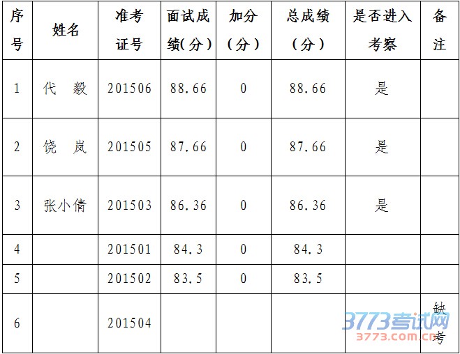 根据遵义市人力资源和社会保障局《遵义市2015年市直机关事业单位面向基层公开择优选调公务员(工作人员)实施方案》的有关规定,以及《遵义市旅游发展委员会公开选调工作人员面试方案》要求,我委于2015年12月19日组织了面试考试,现将成绩公布如下: