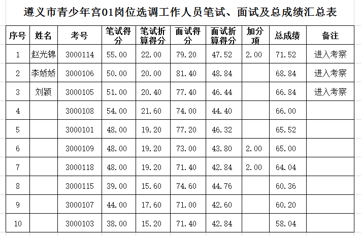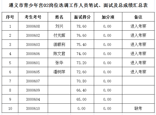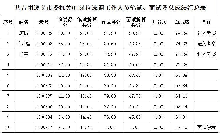 根据《遵义市2015年市直机关事业单位面向基层公开择优选调公务员(工作人员)公告》要求,已完成笔试、面试工作,现从总成绩由高到低的顺序,按照招录职位计划人数1:3的比例确定进入考察阶段人选,进入考察阶段的考生体检等相关事宜另行通知,请考生关注共青团遵义市委网站(http://www.zygqt.org/)通知: