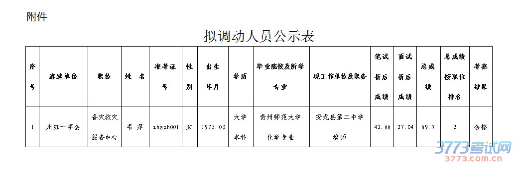 根据《2015年贵州黔西南州红十字会考调事业人员工作方案》规定,经笔试、面试、考察合格,拟调动韦 萍同志到黔西南州红十字会工作,现予以公示。