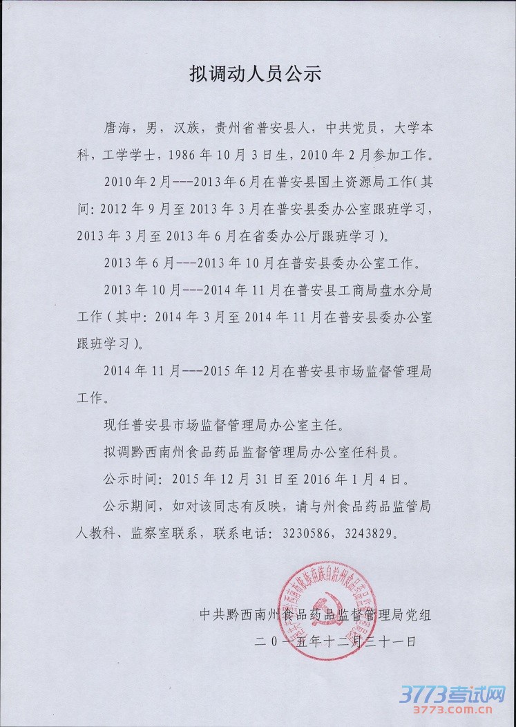 [图文]2015贵州黔西南州食品药品监督管理局拟调动人员公示