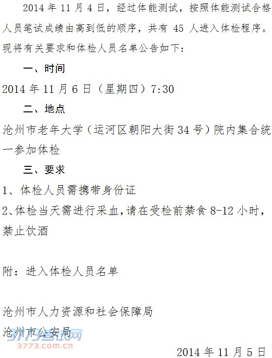 [图文]2014河北沧州市公安局公安辅警补录合格进行体检公告