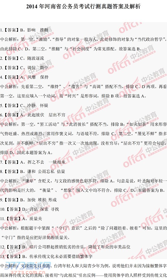 [组图]河南省公务员考试2014年行测真题答案及解析