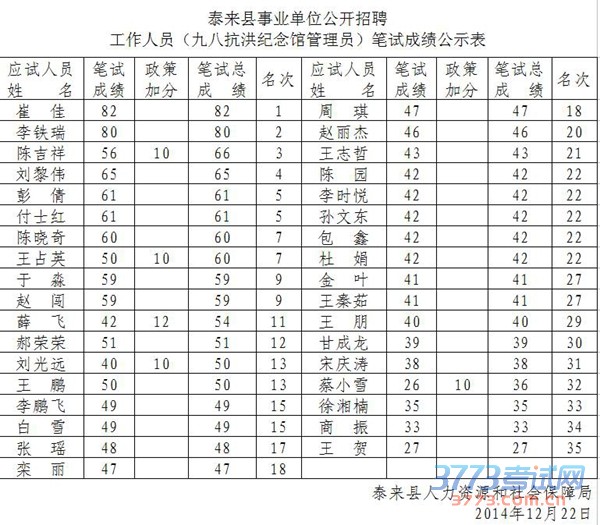 [组图]2014黑龙江齐齐哈尔泰来县事业单位招聘笔试成绩公示