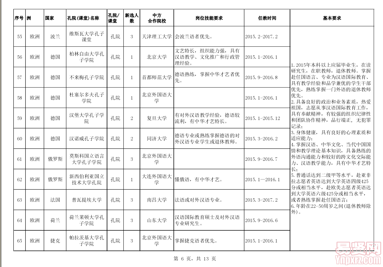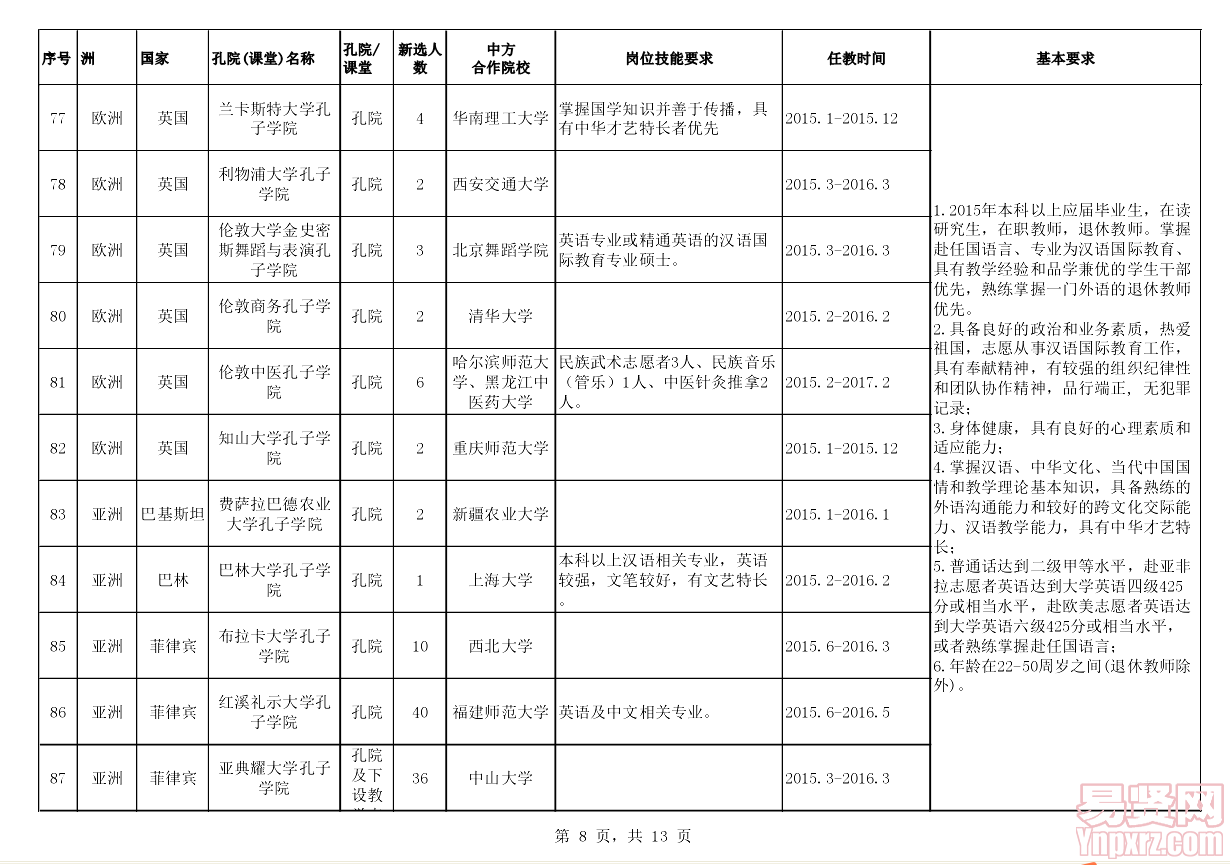 (6)除满足以上基本条件之外,还需满足国别项目的具体要求,详见岗位信息表。孔子学院(课堂)岗位只能从中方合作院校推荐的候选人中选派。