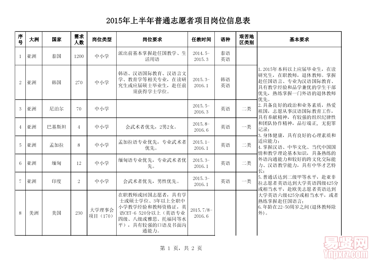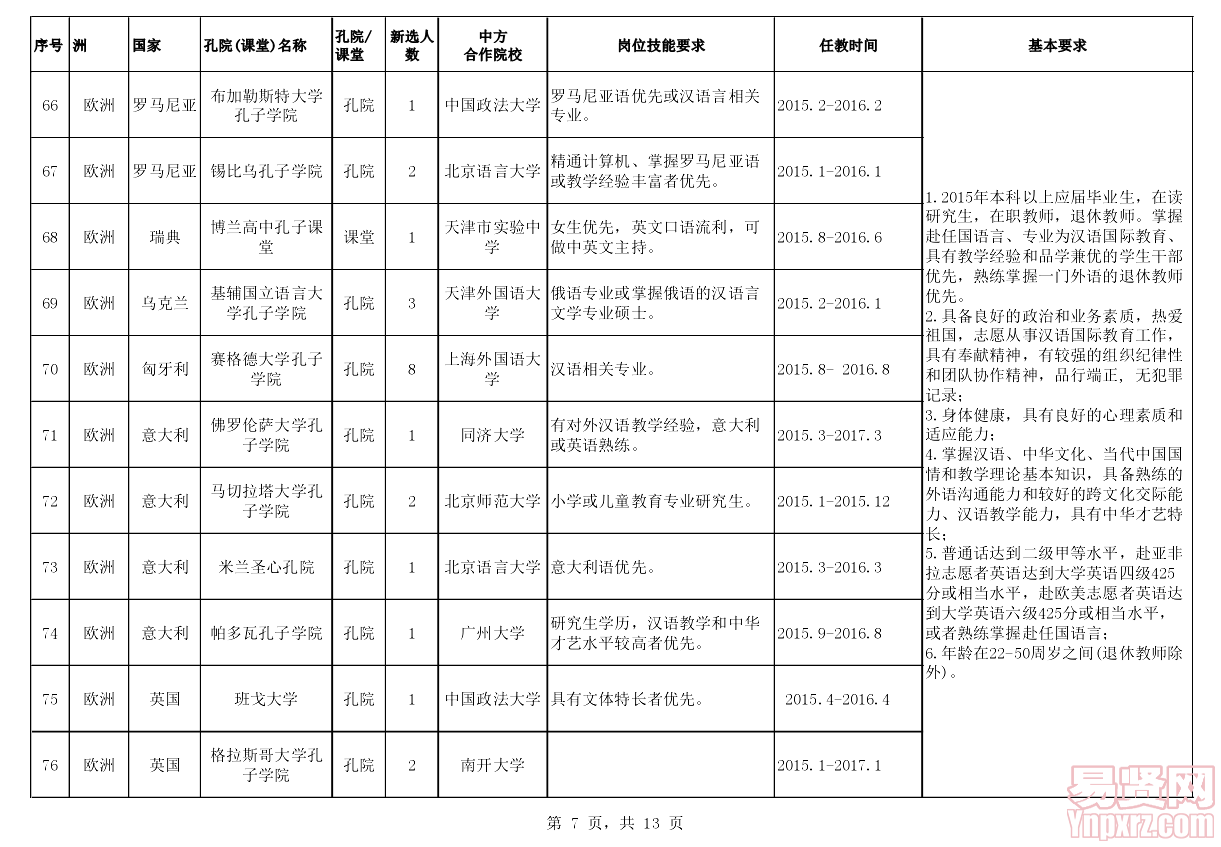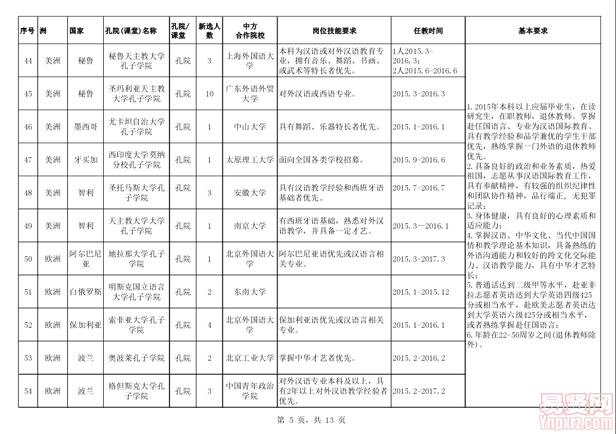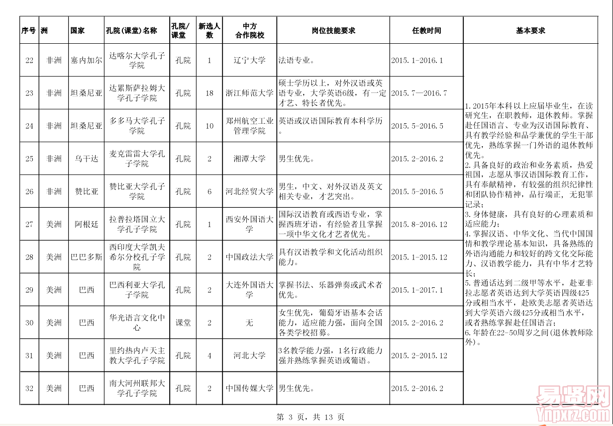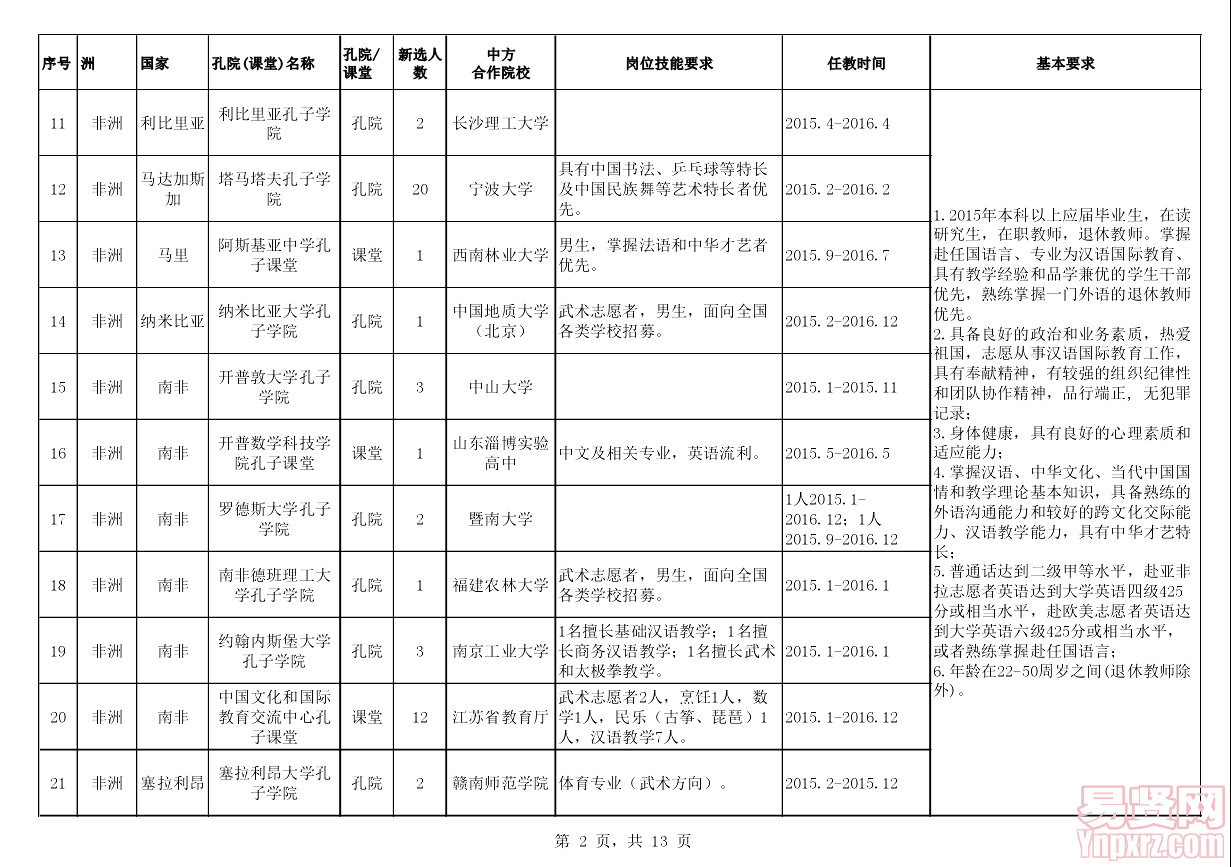 根据外方需求,2015年上半年面向孔子学院中方合作院校招募647名赴孔子学院(课堂)汉语教师志愿者(岗位信息表见附件1),面向全国各类学校招募1850名普通项目汉语教师志愿者(岗位信息表见附件2)。