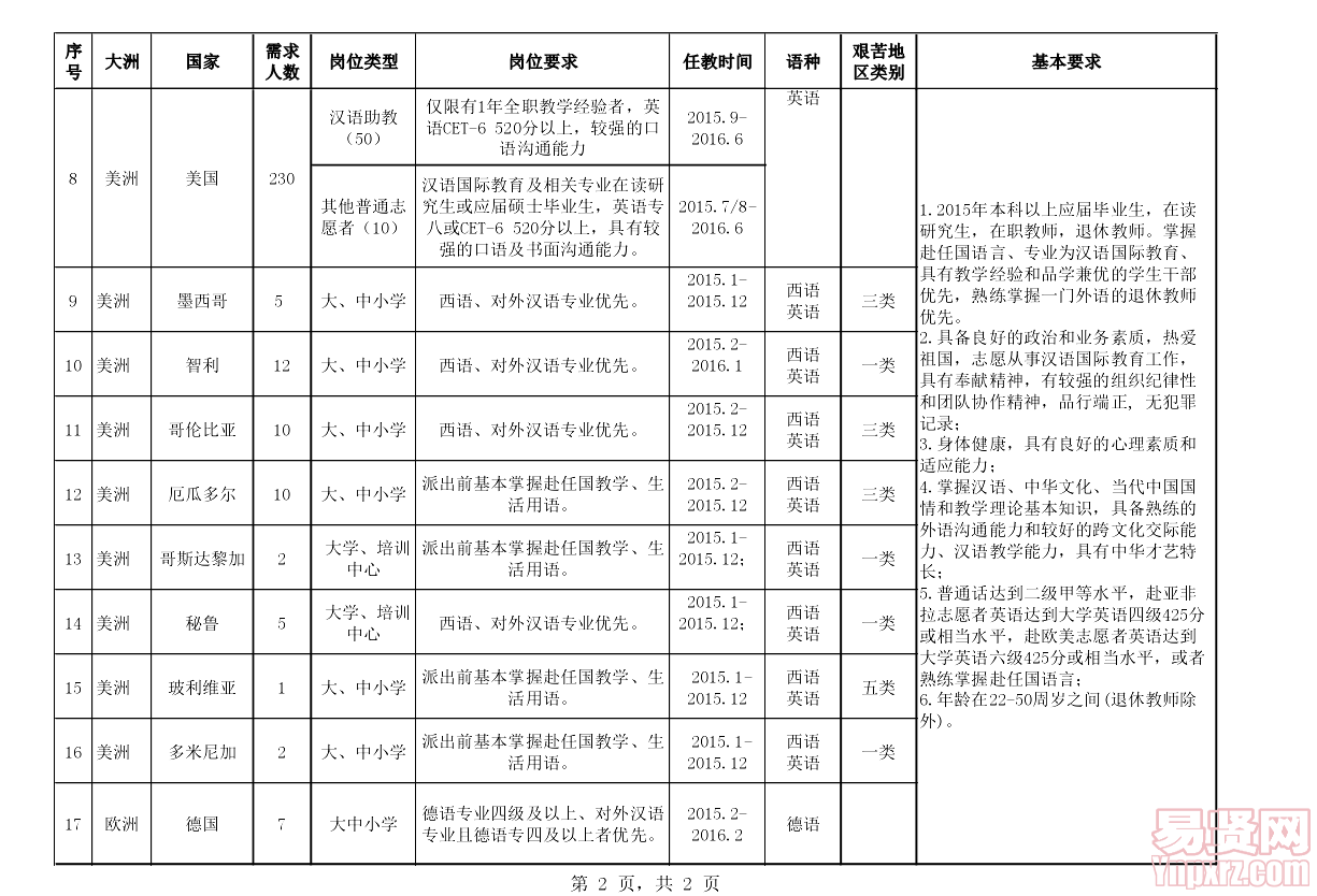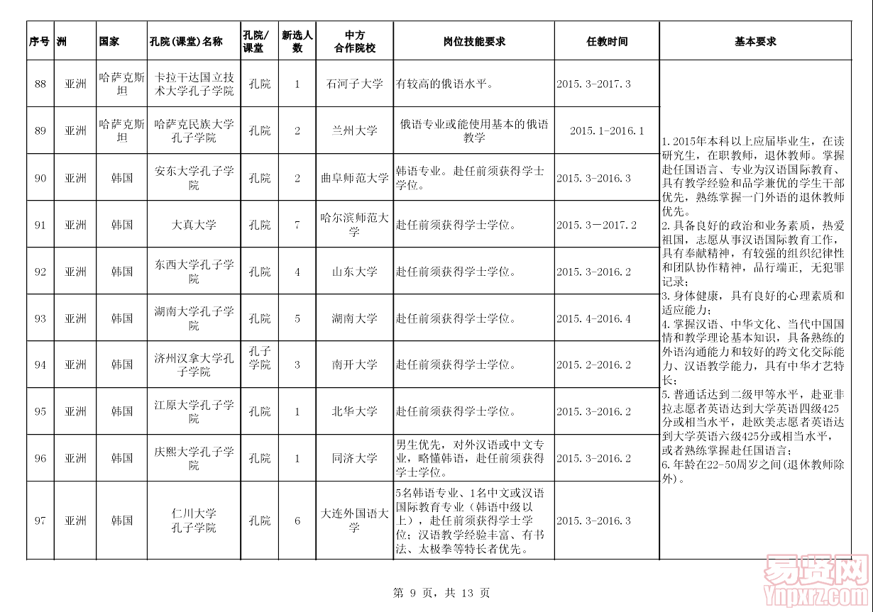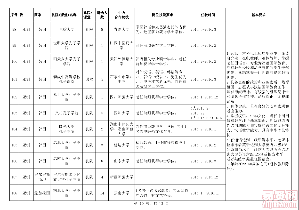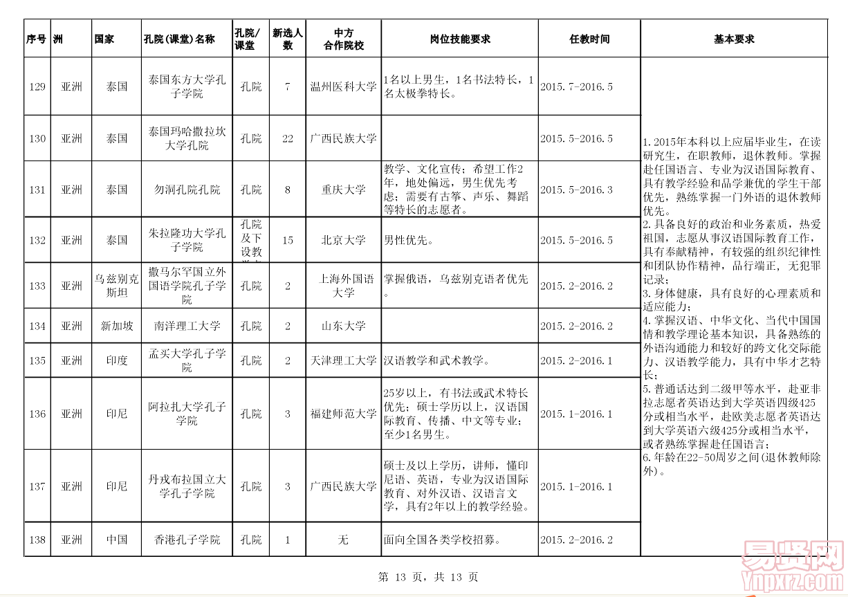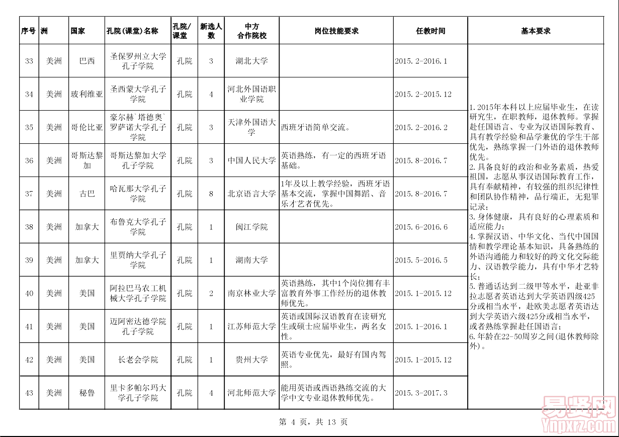 根据外方需求,2015年上半年面向孔子学院中方合作院校招募647名赴孔子学院(课堂)汉语教师志愿者(岗位信息表见附件1),面向全国各类学校招募1850名普通项目汉语教师志愿者(岗位信息表见附件2)。