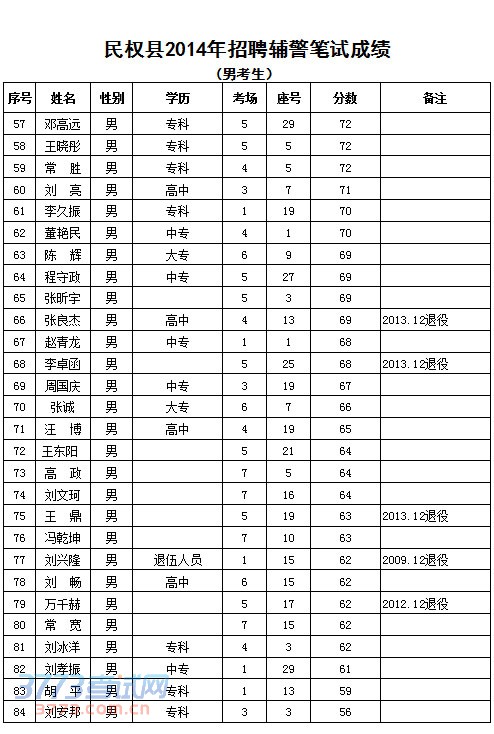 [组图]2014年河南商丘民权县招聘公安辅助人员笔试成绩公告
