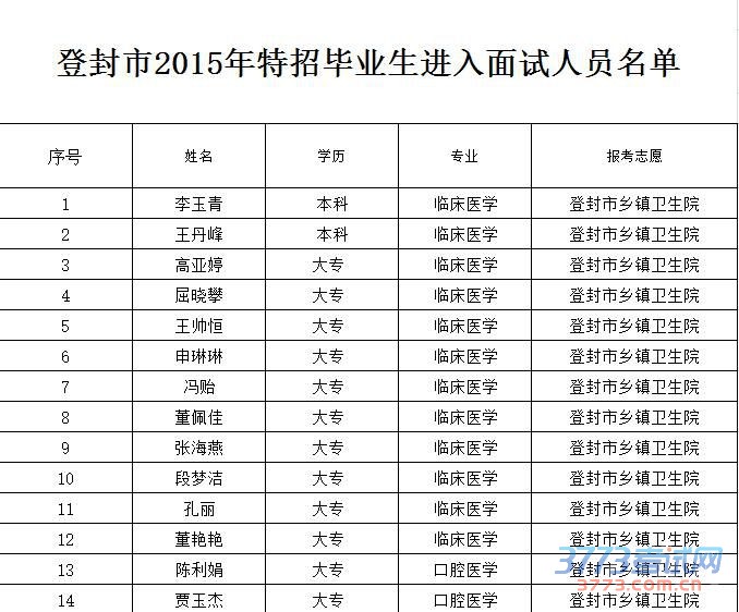 [图文]2015年河南郑州登封市特招医学院毕业生面试人员名单